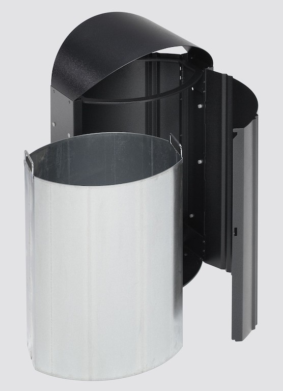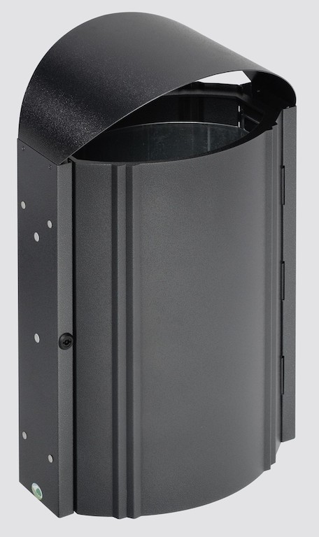 Eleganter und hochwertiger Abfallsammler aus verzinkten Stahlblechen. Als Oberflächenschutz wird eine Struktur-Pulverbeschichtung in antik-silber aufgetragen. Inneneinsatz aus verzinktem Stahlblech. Inhalt ca. 50 ltr. Mit Schutzdach und fest an der Wand verschraubbar.