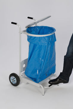 Deckel ca. 410 mm Durchmesser. Gefertigt aus Stahl, pulverbeschichtet. Mit Klemmring zur Sackbefestigung, Pedal zur Deckelöffnung und 2 großen Laufrädern. Lieferung zerlegt. Einfache Montage.