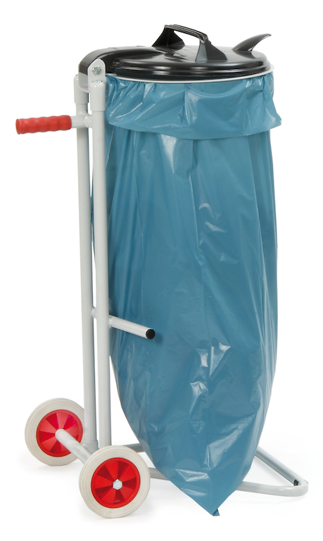 Der Abfallsammler ist in stabiler und sauber verschweißter Stahlkonstruktion mit hochwertiger Pulverbeschichtung gefertigt und mit einem Stellbügel und zwei Vollgummirädern ausgestattet. In das Gestell mit PVC-Deckel und -Klemmring lassen sich 120-Liter-Abfallsäcke einhängen.