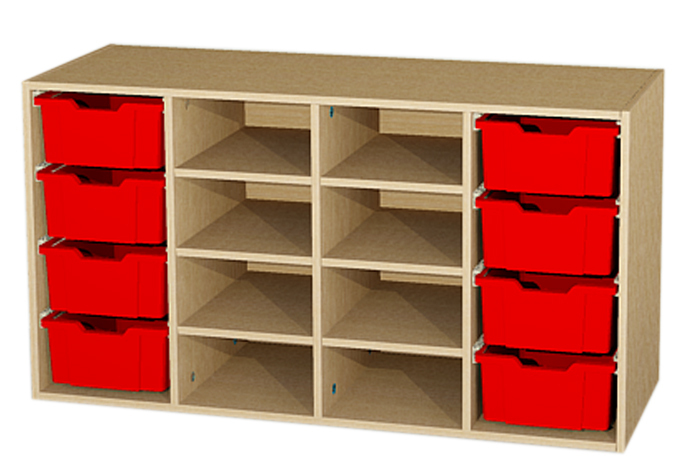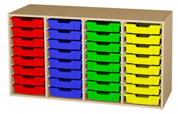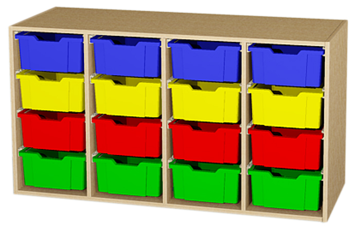 Aufsatzschrank mit 4 x 4 hohen Kunststoffschüben. Außenmaße (B/H/T): 138,4cm x 75cm x 50cm. Diese Möbel werden vollmontiert geliefert. Das Schrank- und Regalsystem ist variabel, äußerst stabil, erweiterbar und ausbaufähig. Dieses Produkt wird ausnahmslos aus hochwertigen und schadstoffarmen Qualitätsspanplatten von 19 mm (E1) führender deutscher Hersteller gefertigt. Für die Verbindungen der Schrankseiten mit Boden und Deckel werden generell Holzdübel verwendet, zusätzlich zu den Konstruktionsbeschlägen. Die Stabilität der Schränke wird somit erhöht. Die mit Nut und Feder verleimten Rückwände, sind 10 - 19 mm stark. Die Farben der Kunststoffschübe können Sie bei Ihrem Auftrag wunschgemäß bestellen in: blau, rot, grün, gelb oder transparent.