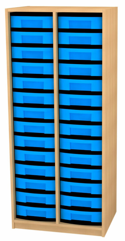 Materialschrank offen. (H/B/T) 152 x 64 x 50 cm. Der Materialschrank ist ein Unterschrank mit Sockel, Sichtrückwand in Nut und Feder verleimt, 19 mm stark, herausnehmbare Kunststoffschübe, einfarbig oder farblich sortiert, auf Kunststoffschienen gleitend. Dekor nach Auswahl. Der Materialschrank wird im zusammengebauten Zustand an die Verwendungsstelle geliefert.