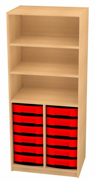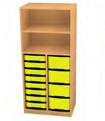 Materialschrank offen. (HxBxT) 152 x 66 x 50cm. Der Materialschrank ist ein Unterschrank mit Sockel, Sichtrückwand in Nut und Feder verleimt, 19 mm stark, herausnehmbare Kunststoffschübe, einfarbig oder farblich sortiert, auf Kunststoffschienen gleitend. Dekor nach Auswahl. Der Materialschrank wird im zusammengebauten Zustand an die Verwendungsstelle geliefert.