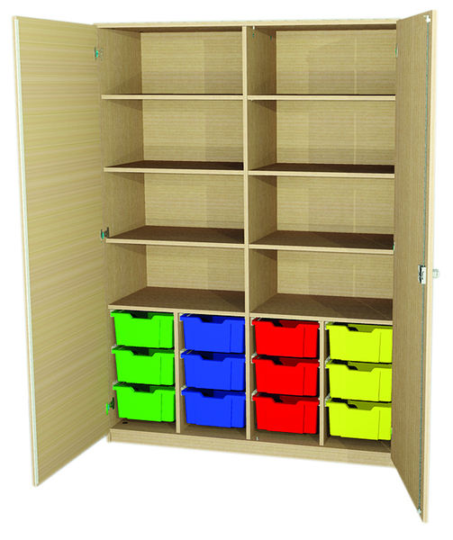 | 2 x 3 Einlegeböden | 12 hohe Kunststoffkästen | 2 Türen, abschließbar |