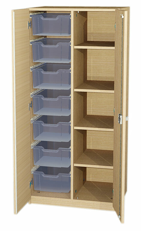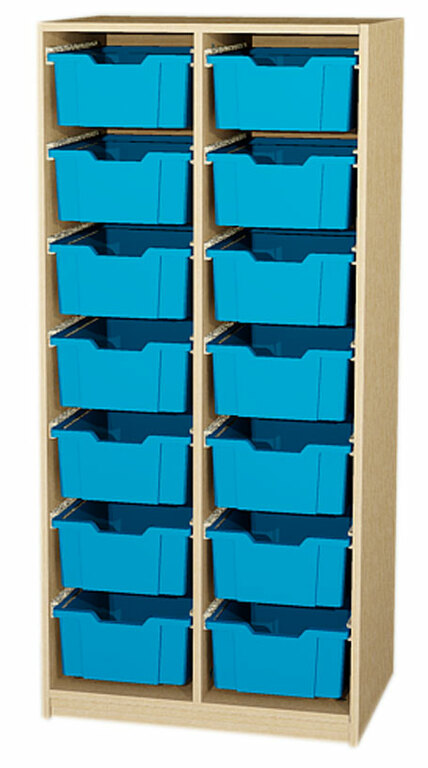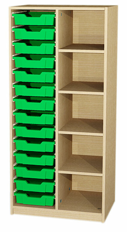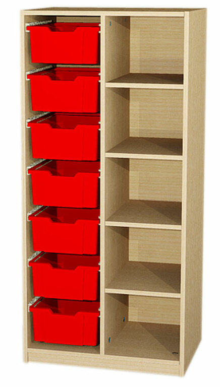 Materialschrank mit flache / hohe Eigentumsboxen, ist (HxBxT) 152 x 70,2 x 50cm. Der Materialschrank als Kunststoffschublade verwendet werden können. Der Materialschrank hat 1x Trennwand, Sockel, Sichtrückwand ist mit Nut und Feder verleimt, 19 mm stark, herausnehmbare Kunststoffschübe einfarbig oder farblich sortiert, auf Kunststoffschienen gleitend. Dekor nach Auswahl.