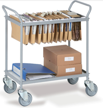 Postverteilwagen mit Stahlgestell, pulverbeschichtet, in Silbergrau (ähnl. RAL 7001). Kunststoffbeschichtete Platten in Lichtgrau (ähnl. RAL 7035).
