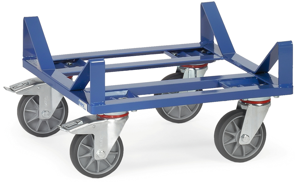 2 Lenkrollen mit Feststellern gemäß der Europäischen Norm EN 1757-3 (Sicherheit von Plattformwagen) und 2 Bockrollen. Standard-Ausführung mit TPE-Bereifung. Alle anderen Bereifungsarten gegen Mehrpreis erhältlich.