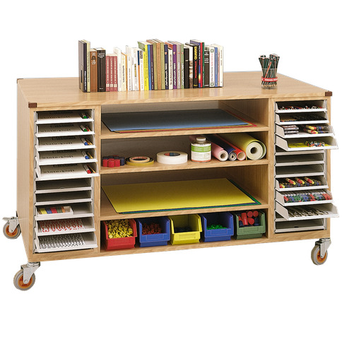 Seine 24 / 48 Schübe bieten genug Platz für Blätter bis DIN-A4. Die 3 großen Fächer in der Mitte eigenen sich um größere Papierbögen oder Arbeitsmittel darin zu verstauen. In den 5 kleinen Materialboxen verschwinden kleinere Arbeitsmaterialien die Sie benötigen. So haben Sie immer alles griffbereit und können sofort loslegen.