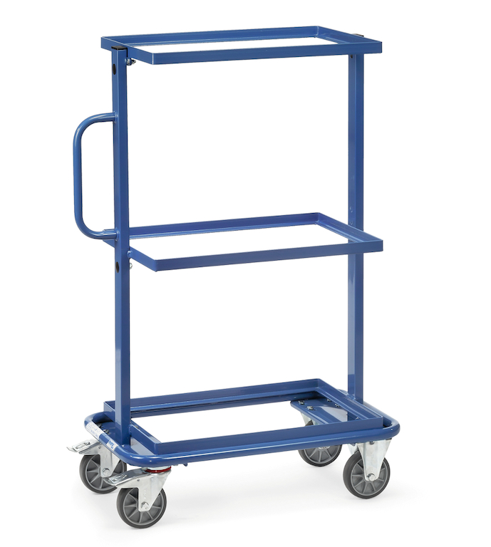 Der Beistellwagen aus Stahlrohr und Profilstahl-Konstruktion mit hochwertiger Pulverbeschichtung ist ideal für den Transport von Eurokästen oder als Beistellwagen für Kleinteile in Produktion und Montage geeignet.