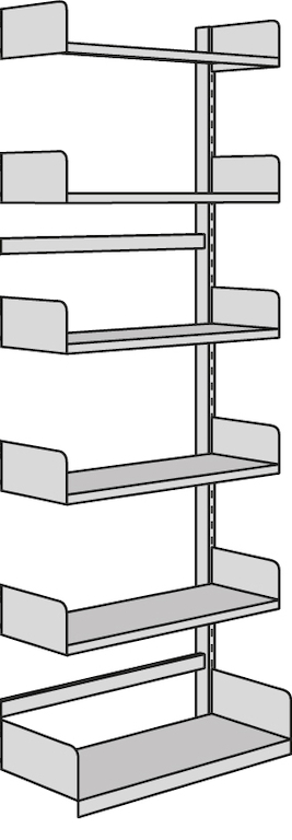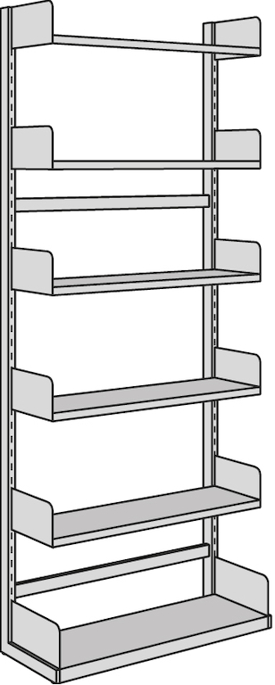 Einseitige Komplett-Regalfelder sind mit Sockel- und Fachböden ausgestattet und werden an der Wand aufgestellt. Das Grundfeld mit 2 Regalpfosten kann als separates Einzelregal verwendet werden oder als Anfangselement für eine Regalwand, die dann durch Anbaufelder mit jeweils einem Regalpfosten beliebig erweitert wird. Die Fachböden können durch weitere Ausstattungselemente ergänzt oder ersetzt werden.