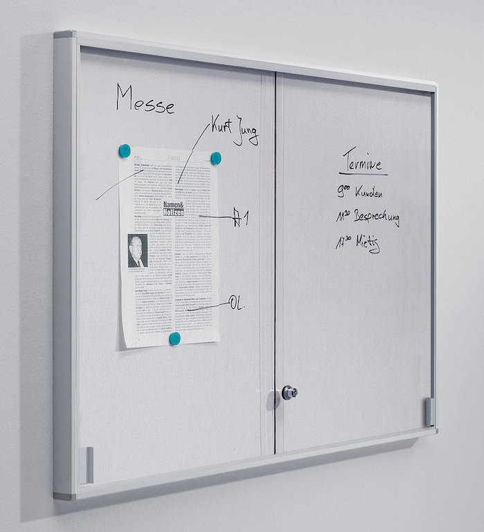 Unsere hochwertigen Schaukästen überzeugen mit einem soliden Aluminiumrahmen und funktionalen Rückwänden. Ob mit einem Magnet geklemmt oder auf der Korkrückwand gepinnt, alles hat hier seine Ordnung.