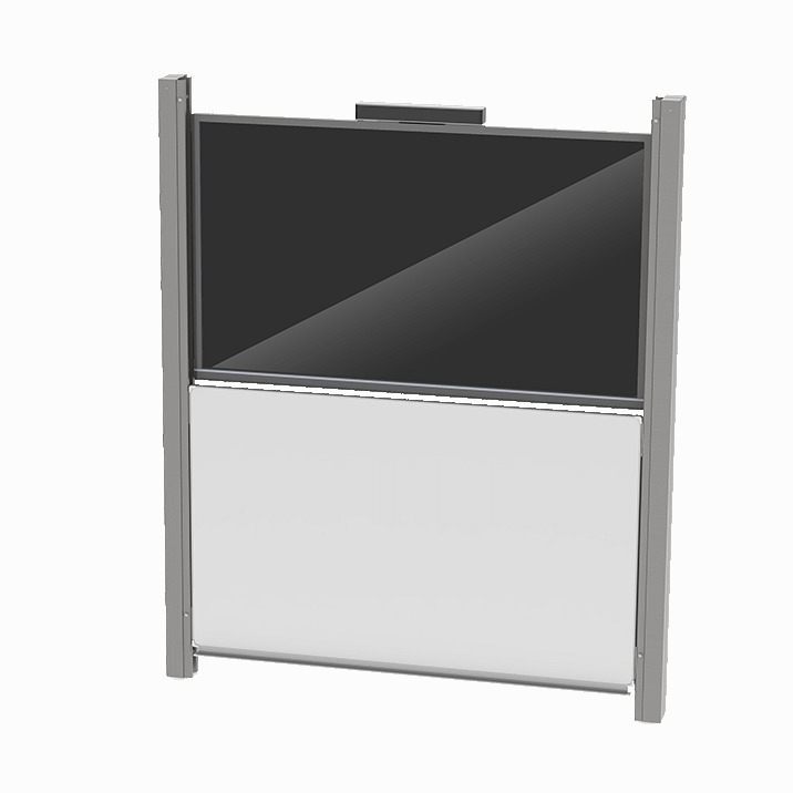 Emaillierte Stahlbleche mit Trägerplatten in Sandwichbauweise verleimt, Plattenstärke 24 mm. Die Kanten der Schreibflächen sind mit natureloxierten Aluminium-Profilen wasserdicht verklebt. Alle Ecken sind mit abgerundeten Kunststoffkappen eingefasst. Schmutzauffangrinnen unter den Seitenflügeln sowie eine großdimensionierte Griff- und Kreideablageleiste aus natureloxiertem Aluminium mit seitlich angeschraubten bündig abschliessenden Kunststoffecken.