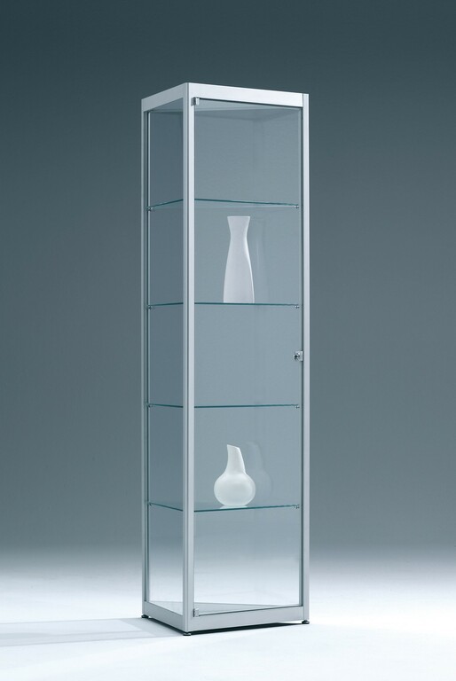 silber eloxiert. Gegen Mehrpreis auch verchromt, im Edelstahlfinish oder RAL-farbbeschichtet erhältlich - Mit 4 höhenverstellbaren Dickglasböden auf Metallfachbodenträgern - auf Wunsch auch durch weitere Böden ergänzbar