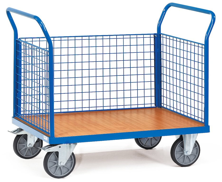Der Dreiwandwagen besteht aus dem Multivario-Basiswagen mit im Profilrahmen liegender Plattform, die mit drei Oberflächenbelägen wählbar ist, zwei Stirnwänden und einer Längswand aus Drahtgitter. Die Stirnwände sind mit Schiebebügel aus Stahlrohr ausgestattet. Ein leistungsstarker Elektroantrieb und weitere Zusatzausstattung sind optional erhältlich. Zubehör wie Drehschemel-Lenkung (Anbausatz), Softgrip, Drahtkorb, Schreibtafel und Scannerhalter bitte separat bestellen.