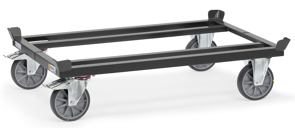 Das robuste Paletten-Fahrgestell in elektrisch leitfähiger ESD-Ausführung mit einer Tragkraft von bis zu 750 kg besteht aus einer Winkelstahl-Schweißkonstruktion mit hochwertiger Pulverbeschichtung. Der umlaufende Rahmen mit um 20 mm abgesenkten Auflageprofilen und die vier Fangecken gewährleisten die sichere Aufnahme und den guten Halt der Paletten und Gitterboxen.