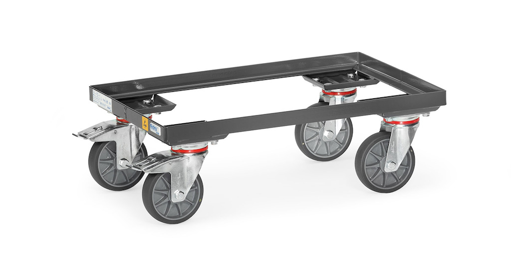 2 Lenkrollen mit Feststeller gemäß der Europäischen Norm EN 1757-3 (Sicherheit von Plattformwagen), 2 Bockrollen.