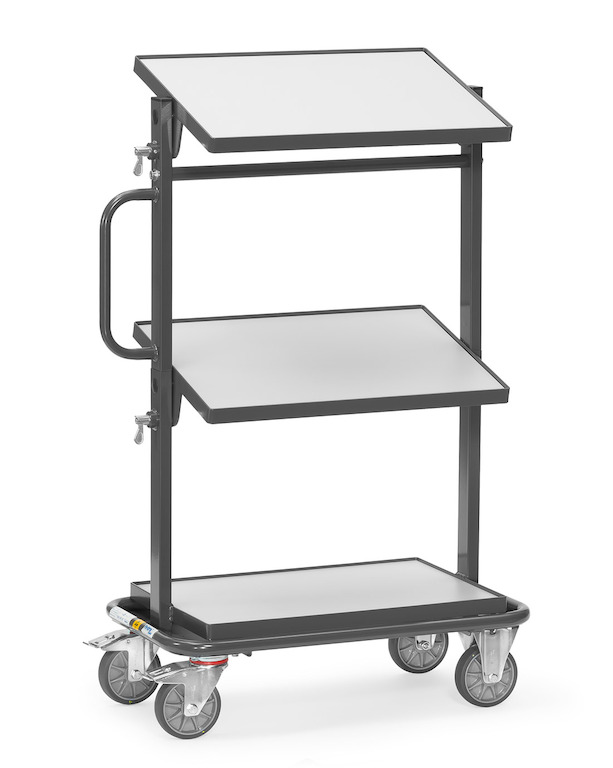 Der ESD-Beistellwagen ist in stabiler Stahlrohr- und Profilstahl-Konstruktion aus elektrisch leitfähigem, geschweißtem Stahlrohr mit hochwertiger Pulverbeschichtung in Schiefergrau gefertigt. Die drei Plattformen bestehen aus elektrisch leitfähigen Holzwerkstoffplatten. Die untere Plattform ist fest montiert, die mittlere und obere Plattform sind nach beiden Seiten um 15° und 30° neigbar, die Arretierung erfolgt mittels Federriegel. Durch die ESD-Ausführung werden empfindliche Waren vor Schäden durch elektrische Entladung geschützt.