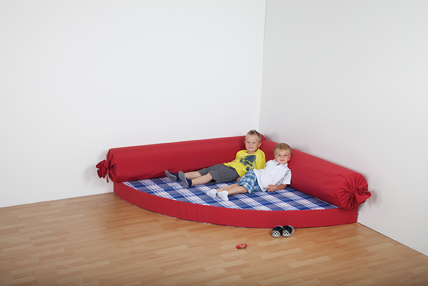 Die Viertelkreiskuschelecke ist auch mit schwer entflammbaren Bezug und Kern erhältlich.