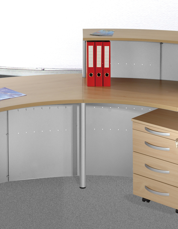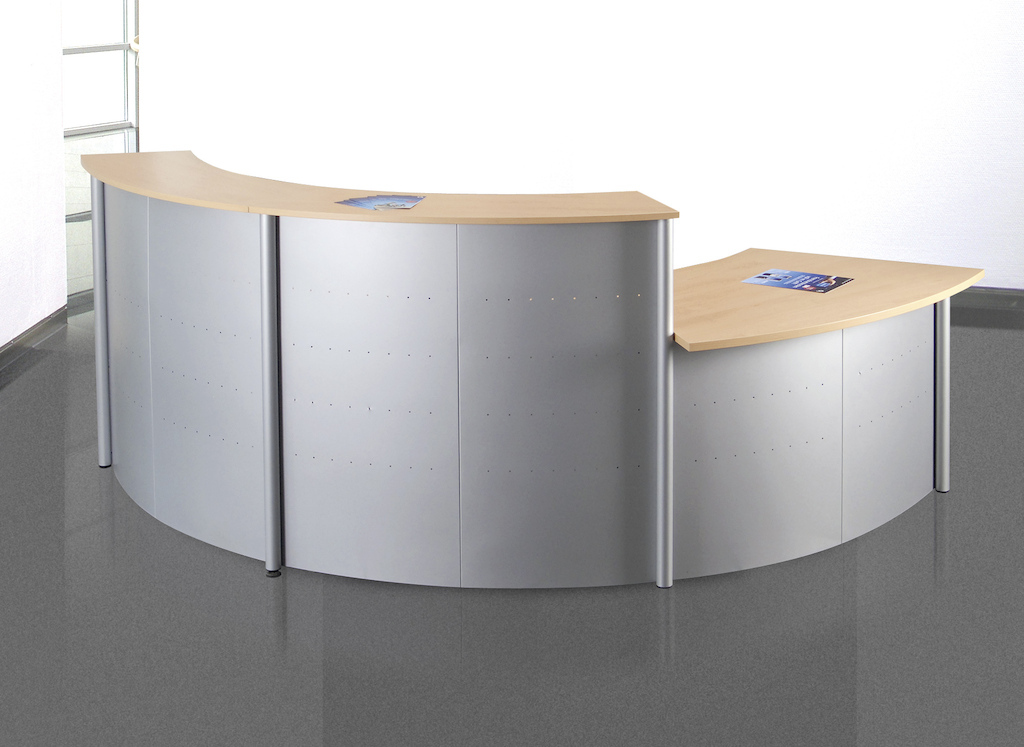 Die hochwertige kompakte Empfangstheke im modernen Design besteht aus zwei Theken, einem Tisch und Seitenblenden. Die Thekenelemente können mit Prospektfächern und Plakattaschen bestückt werden.
