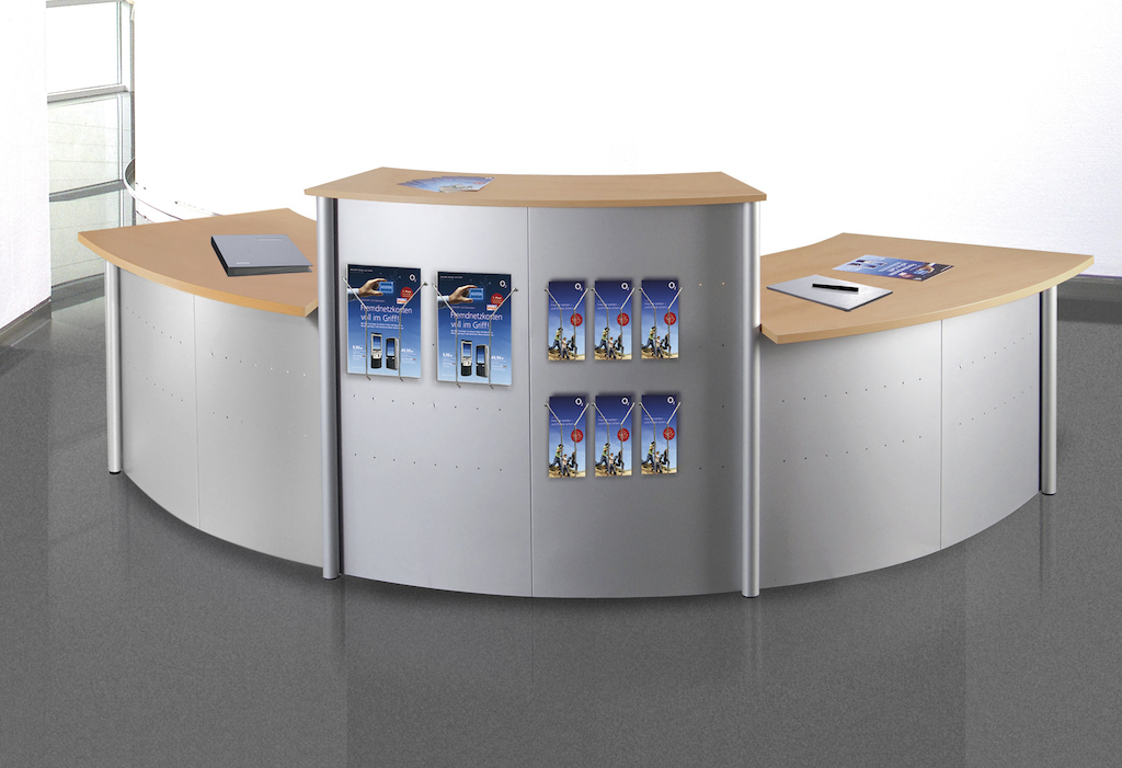 Die hochwertige kompakte Empfangstheke im modernen Design besteht aus zwei Tischen, einer Theke und Seitenblenden. Das Thekenelement kann mit Prospektfächern und Plakattaschen bestückt werden.