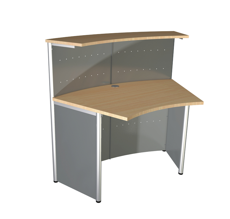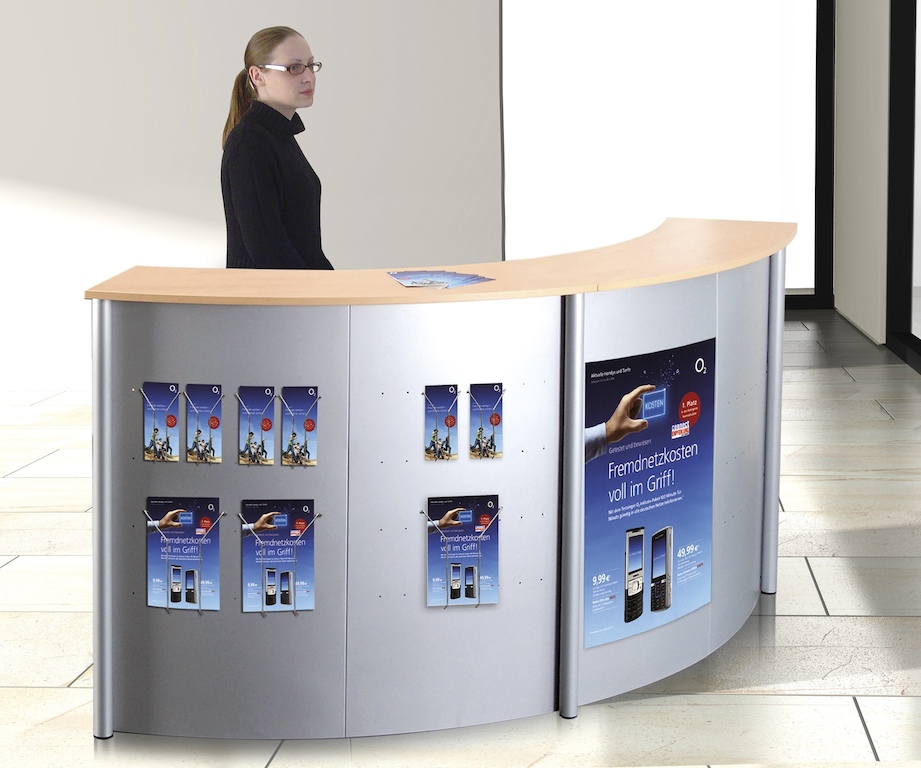 Die schlichte und funktionelle Empfangstheke in gerundeter Form mit beidseitig um 22,5° abgeschrägter Arbeits- und Aufsatzplatte lässt sich mit Prospektfächern und Plakattaschen bestücken. Sie bietet einen vollwertigen Arbeitsplatz. Die Theke ist mit Seitenblenden ausgestatttet und lässt sich daher auch als Einzeltheke verwenden.