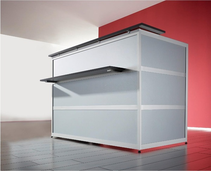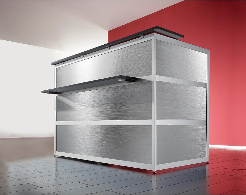 Gerade Grundtheke mit allseitigem Aluminiumrahmen 25x25 u. 46x15 mm, Thekenfront in 3-teiliger Optik, zwei Seitenwangen, Thekenarbeitsplatte in Dekorplatte anthrazit, Kabelkanal, Stellfüße