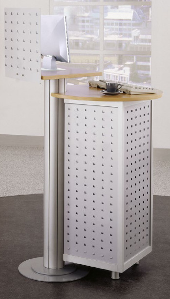 Der moderne Infocounter ALULITE überzeugt durch das extravagante und doch zeitlose Design. Der Korpus aus Aluminium mit rund ausgestanzten Segmenten ist transluzent weiß hinterlegt, das Standard-Dekor für die Platten ist Buche. Der kompakte Counter beansprucht nur wenig Platz, ist jedoch mit dem Bildschirmdrehboard und dem integrierten Staufachschrank äußerst benutzerfreundlich und vielseitig einsetzbar.
