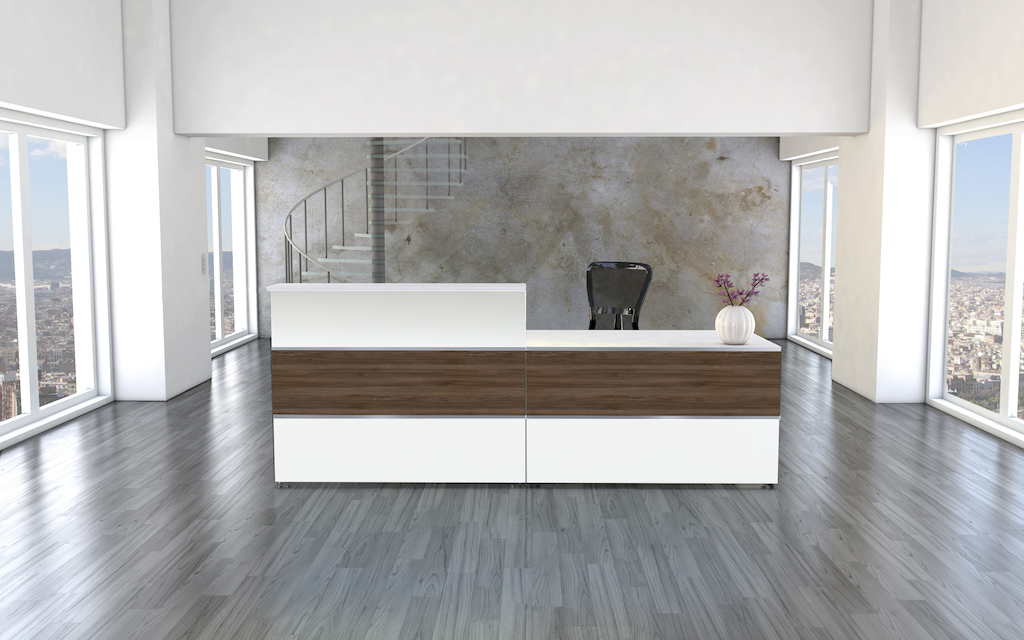 Die Empfangstheken-Kombination besteht aus einer Empfangstheke, einem Empfangstisch und Seitenblenden. Sie überzeugt durch das schlichte und doch elegante Design.