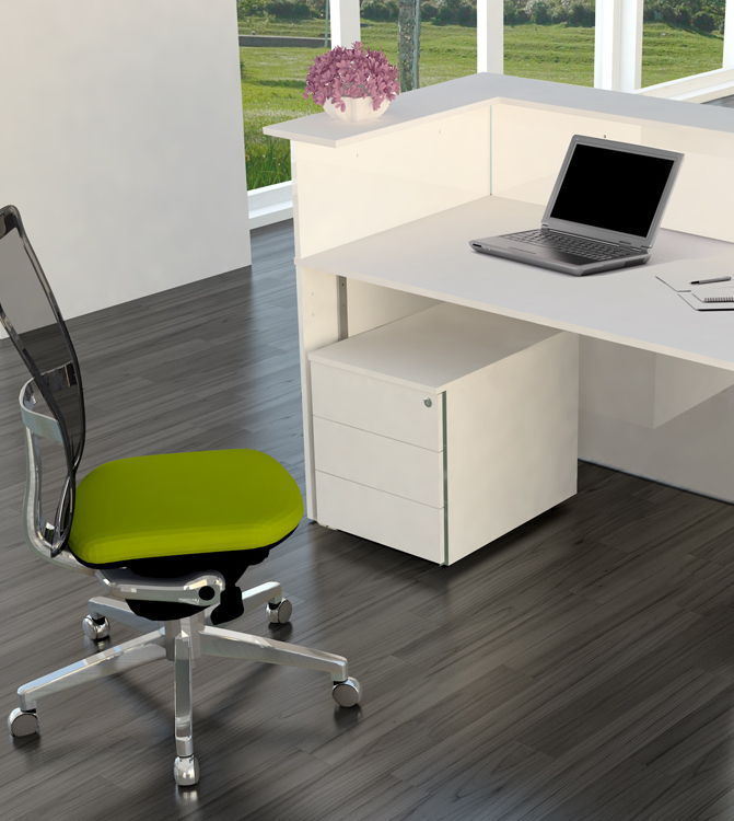 Die Empfangstheke im schlichten und eleganten Design besteht aus 2 Ecktheken. Sie bietet zwei vollwertige Arbeitsplätze und ist in zwei attraktiven Dekorvarianten erhältlich. Als Zusatzausstattung gibt es für jedes Element eine LED-Leuchtleiste, eine Taschenablage und einen Rollcontainer.