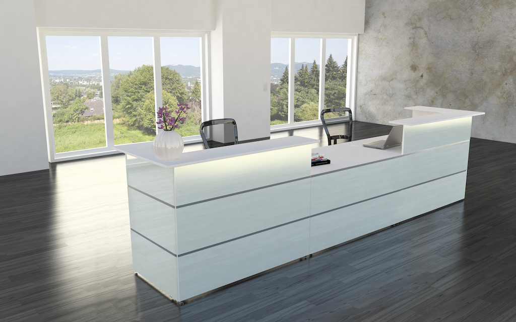 Diese Empfangstheke lässt sich durch weitere Anbautheken und Anbautische aus dem Empfangstheken-Programm Atlantis beliebig erweitern.