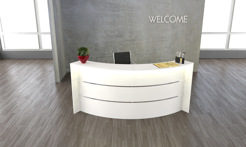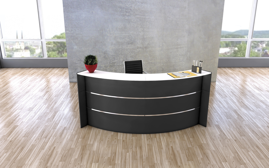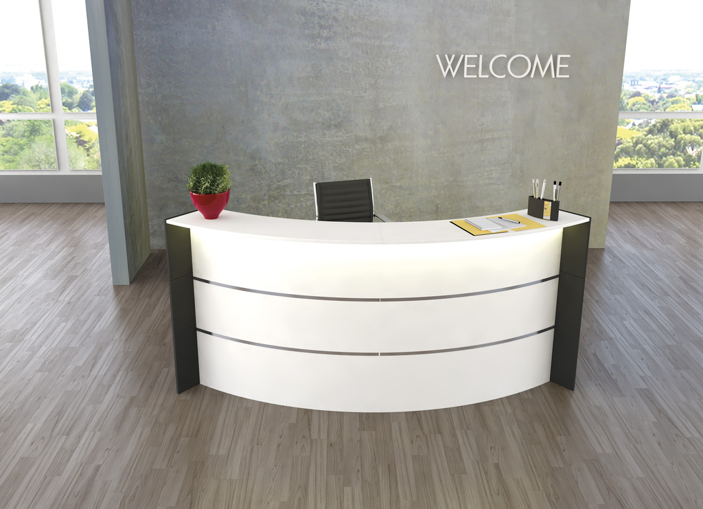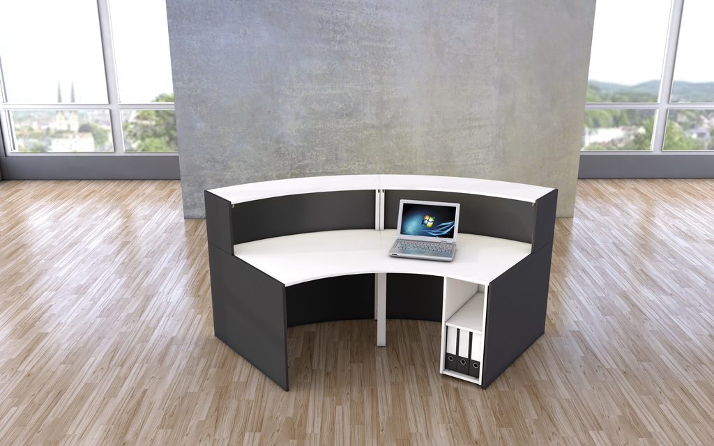 Mit den modernen Designtheken aus dem Empfangstheken-Programm Bari schaffen Sie eine besondere Athmosphäre in Ihrem Empfangsbereich. Das Thekensystem eignet sich sowohl für kleine als auch für große Empfangsbereiche. Die Theken Bari bestehen aus einer Kombination von Stahl- und Holzelementen in einem Zusammenspiel der Farben Anthrazit und Weiß. Hinter den 110 cm hohen Fronten befindet sich ein vollwertiger Arbeitsplatz mit einer Tiefe von 80 cm und einer Höhe von 74 cm. Sämtliche Holzteile sind melaminharzbeschichtet und mit einer Dickkante aus ABS versehen. In die Tischplatten der hohen Elemente ist jeweils eine Kabeldurchlassdose eingebaut. Als besonderes Highlight können alle Thekenkonfigurationen mit einer entsprechenden LED-Beleuchtung ausgestattet werden.
