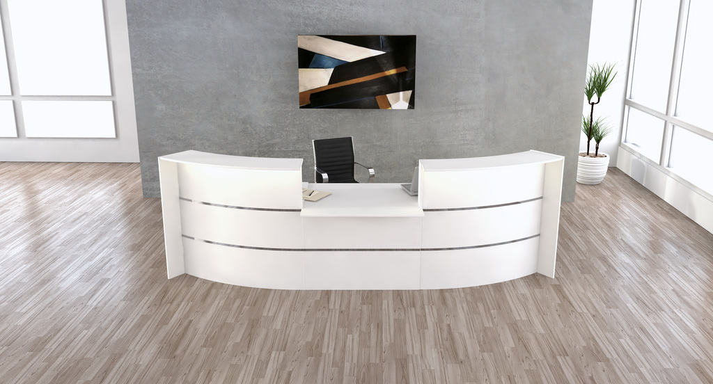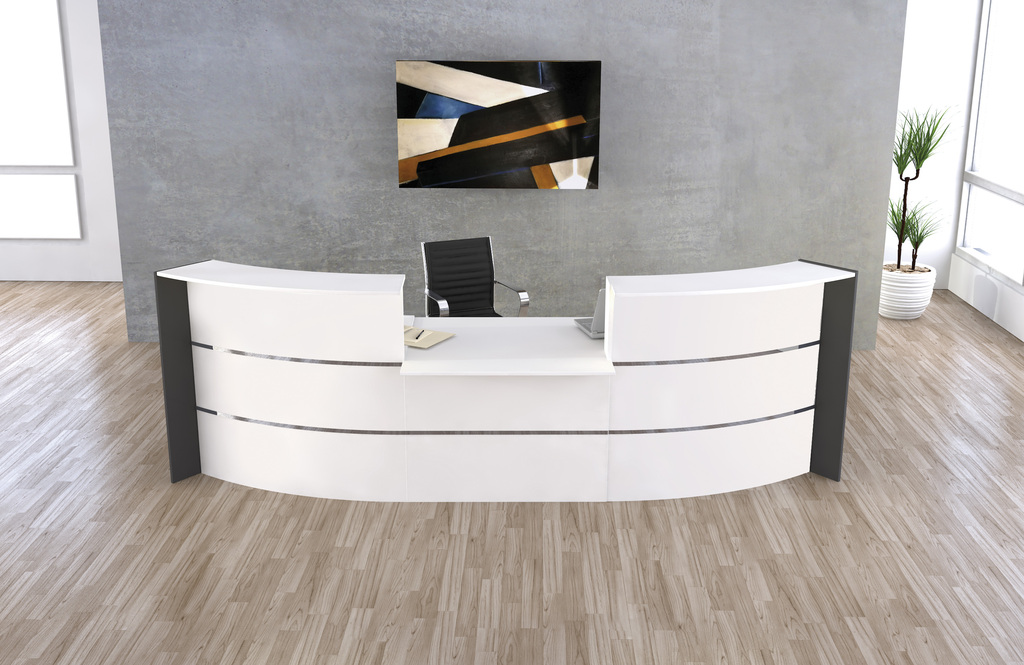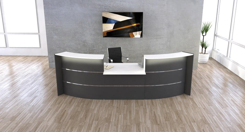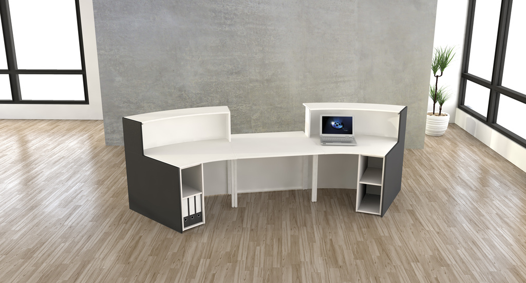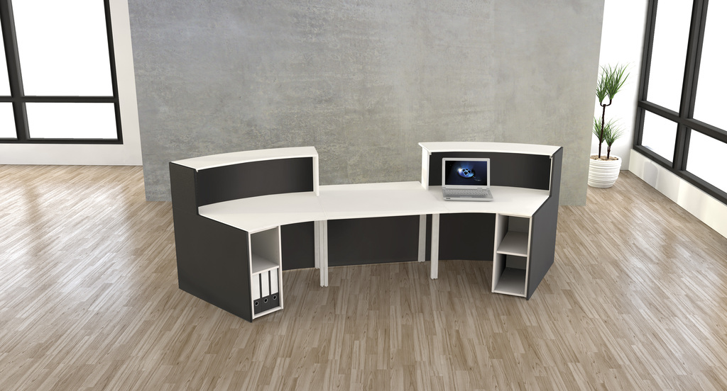 Mit den modernen Designtheken aus dem Empfangstheken-Programm Bari schaffen Sie eine besondere Athmosphäre in Ihrem Empfangsbereich. Das Thekensystem eignet sich sowohl für kleine als auch für große Empfangsbereiche. Die Theken Bari bestehen aus einer Kombination von Stahl- und Holzelementen in einem Zusammenspiel der Farben Anthrazit und Weiß. Hinter den 110 cm hohen Fronten befindet sich ein vollwertiger Arbeitsplatz mit einer Tiefe von 80 cm und einer Höhe von 74 cm. Sämtliche Holzteile sind melaminharzbeschichtet und mit einer Dickkante aus ABS versehen. In die Tischplatten der hohen Elemente ist jeweils eine Kabeldurchlassdose eingebaut. Als besonderes Highlight können alle Thekenkonfigurationen mit einer entsprechenden LED-Beleuchtung ausgestattet werden.