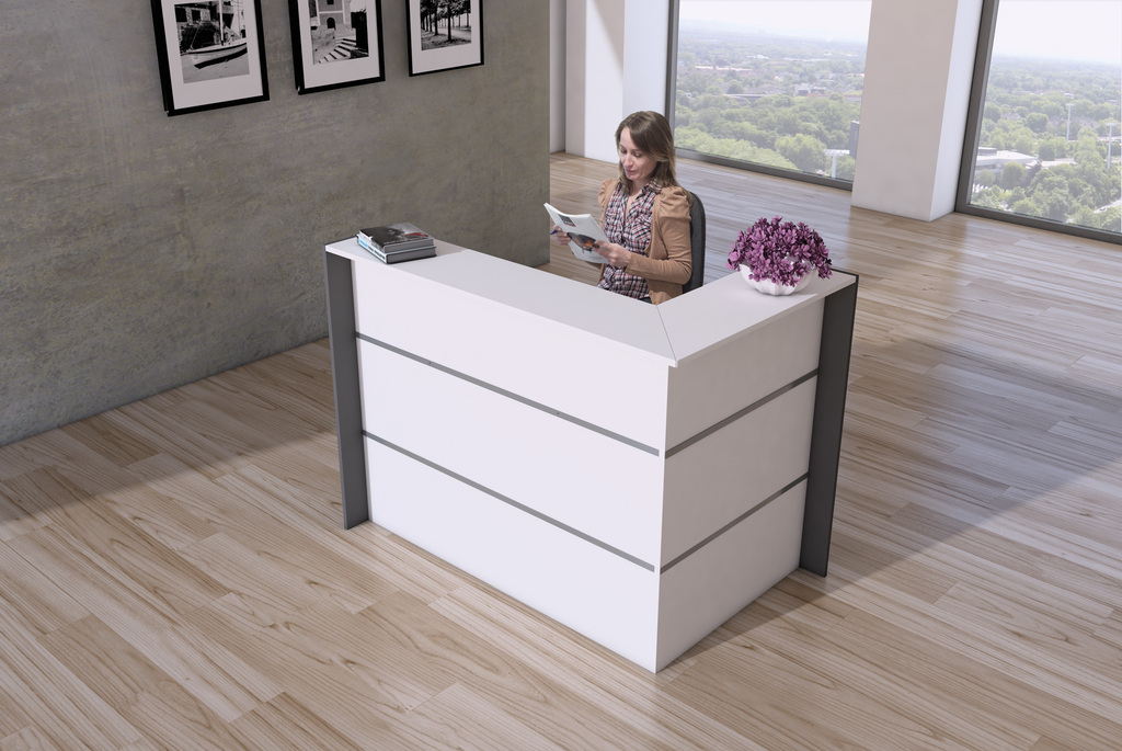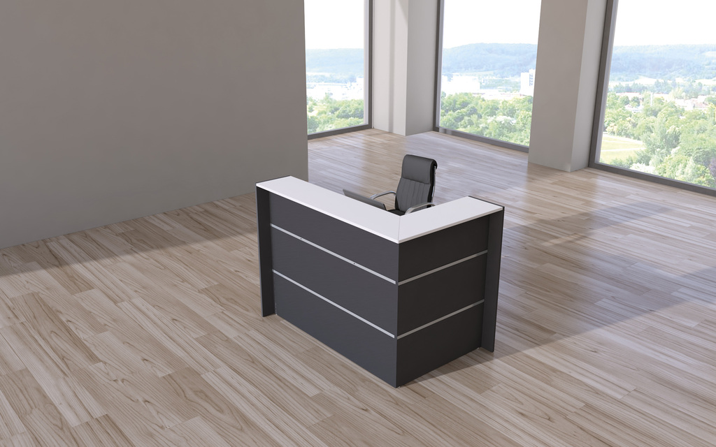 Mit den modernen Designtheken aus dem Empfangstheken-Programm Bari schaffen Sie eine besondere Athmosphäre in Ihrem Empfangsbereich. Das Thekensystem eignet sich sowohl für kleine als auch für große Empfangsbereiche. Die Theken Bari bestehen aus einer Kombination von Stahl- und Holzelementen in einem Zusammenspiel der Farben Anthrazit und Weiß. Hinter den 110 cm hohen Fronten befindet sich ein vollwertiger Arbeitsplatz mit einer Tiefe von 80 cm und einer Höhe von 74 cm. Sämtliche Holzteile sind melaminharzbeschichtet und mit einer Dickkante aus ABS versehen. In die Tischplatten der hohen Elemente ist jeweils eine Kabeldurchlassdose eingebaut. Als besonderes Highlight können alle Thekenkonfigurationen mit einer entsprechenden LED-Beleuchtung ausgestattet werden.