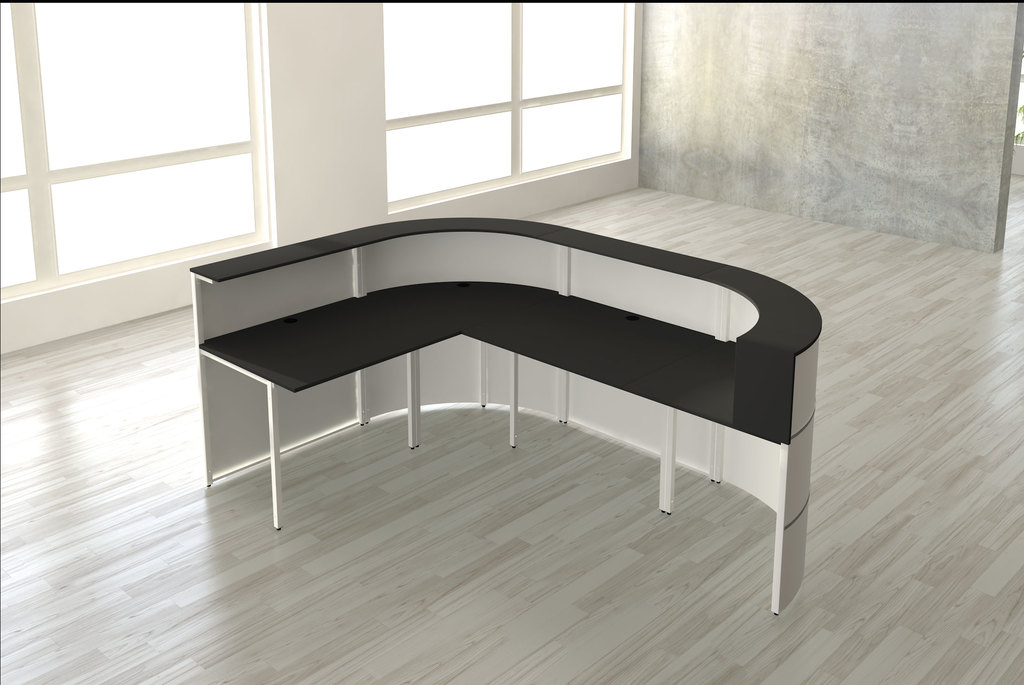 Mit dieser Empfangstheke im modernen und schwungvollen Design mit vollwertigem Arbeitsplatz schaffen Sie Atmosphäre im Empfangsbereich.