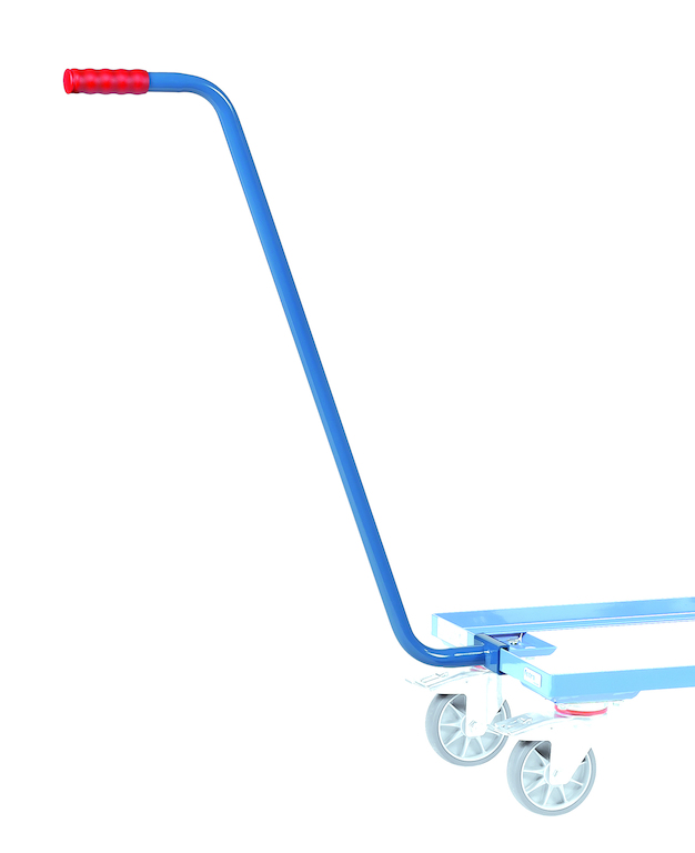 Einhängedeichsel aus Stahlrohr mit Pulverbeschichtung in blau (RAL 5007). Mit rotem Griffaufsatz.