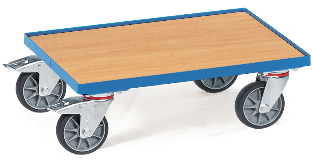 4 Lenkrollen, 2 davon mit Feststellern gemäß der Europäischen Norm EN 1757-3 (Sicherheit von Plattformwagen) oder 4 Lenkrollen ohne Feststeller. Standard-Ausführung mit TPE-Bereifung. Alle anderen Bereifungsarten gegen Mehrpreis erhältlich.