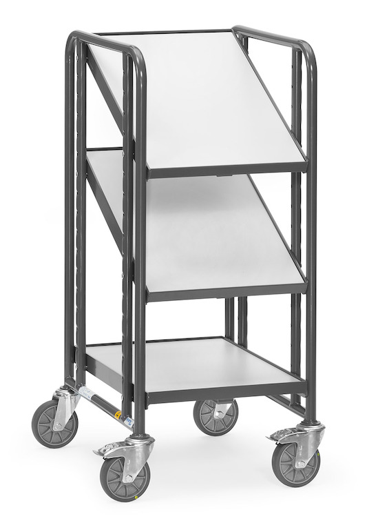 Die Etagen bestehen aus im Winkelstahlrahmen liegenden elektrisch leitfähigen Holzwerkstoffplatten mit Oberfläche im Dekor Hellgrau. Die untere Etage ist fest montiert, die mittlere und obere Etage ist im Raster von 50 mm variabel entweder waagerecht oder geneigt (Neigung 15° oder 30°) einschraubbar. Jede Etage bietet Platz für einen Eurokasten im Format 600 x 400 mm. Eurokästen in gewünschter Anzahl und Größe bitte separat bestellen.