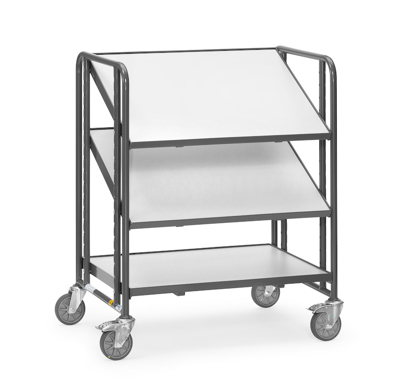 Die Etagen bestehen aus im Winkelstahlrahmen liegenden elektrisch leitfähigen Holzwerkstoffplatten mit Oberfläche im Dekor Hellgrau. Die untere Etage ist fest montiert, die mittlere und obere Etage ist im Raster von 50 mm variabel entweder waagerecht oder geneigt (Neigung 15° oder 30°) einschraubbar. Jede Etage bietet Platz für zwei Eurokästen im Format 600 x 400 mm. Eurokästen in gewünschter Anzahl und Größe bitte separat bestellen.