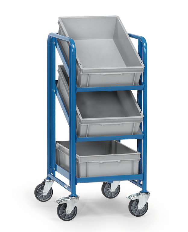 Die Etagen bestehen aus offenen Winkelstahlrahmen und sind im Raster von 50 mm variabel entweder waagerecht oder geneigt (Neigung 15° oder 30°) einschraubbar. 3 Eurokästen 600x400 mm sind inklusive.