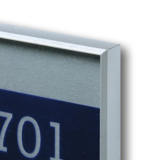 Rahmen und Grundfläche des Fahnenschilds L sind aus silber eloxiertem Aluminium gefertigt. Die Rahmenbreite beträgt lediglich 1,5 mm, die Rahmentiefe 10 mm. Durch eine kleine Fase in der Ansicht wirkt der Rahmen noch dezenter. Die Wandmontage erfolgt mit stabilen Winkeln aus Aluminium oder Acrylglas.