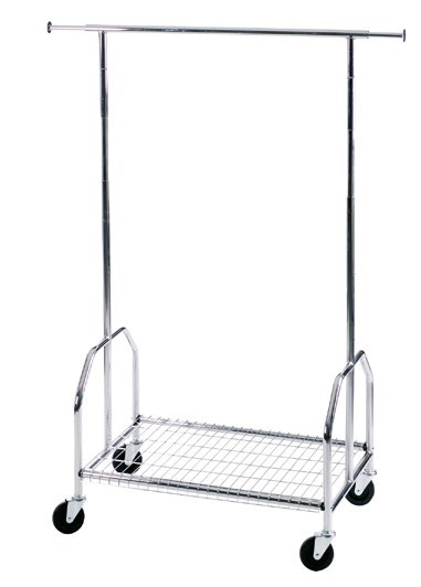 Garderobenwagen aus Metall (verchromt), sehr stabile Ausführung (Rohr-Ø ca. 25mm), einstellbar auf 3 Höhen (ca. 130-150-170 cm), seitlich ausziehbare Holme (bis zu 150cm Hängefläche), auf 4 großen Lenkrollen aus Vollgummi (Ø ca. 100 mm), mit Gitterablage.