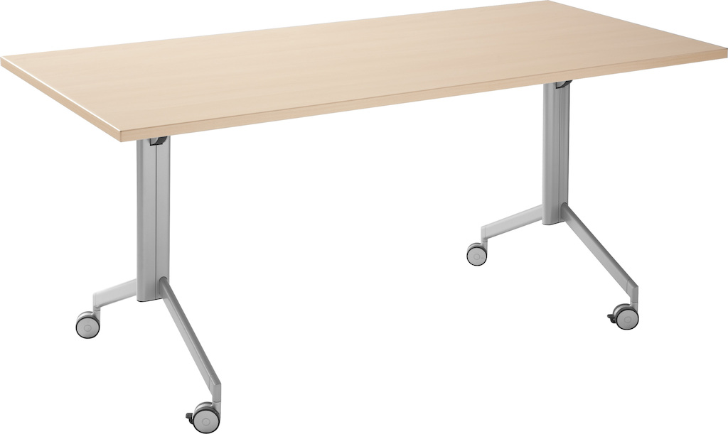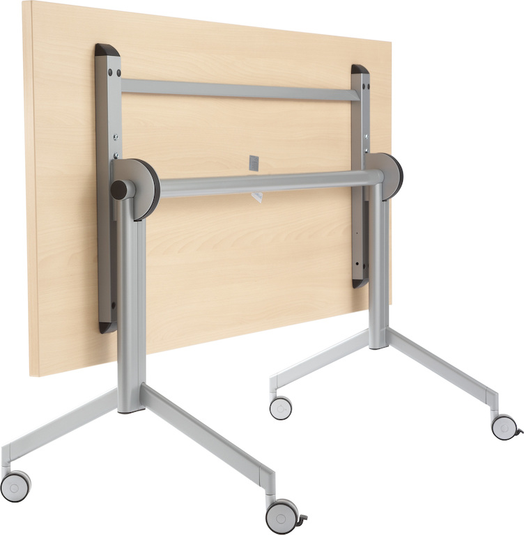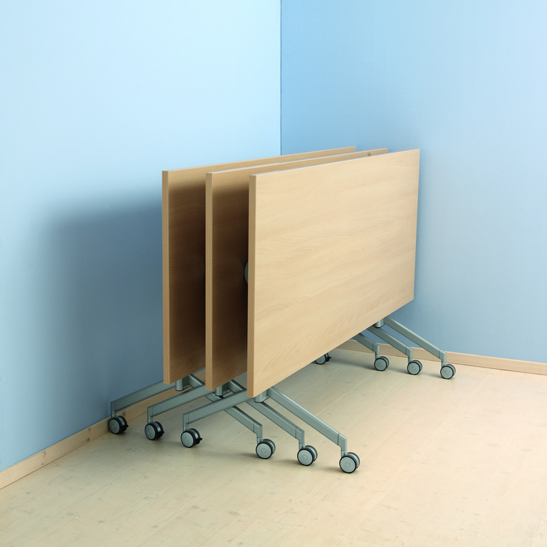 Wo Tische regelmäßig benutzt werden, der Raum aber auch anderweitig genutzt werden soll, ist der Falttisch Plico die ideale Lösung. Die Tischplatte lässt sich einfach hochkant klappen und die rollenden Tische können platzsparend zusammengeschoben werden.