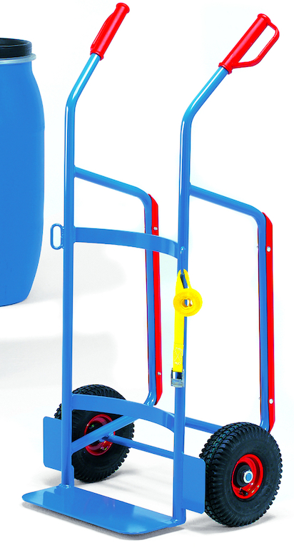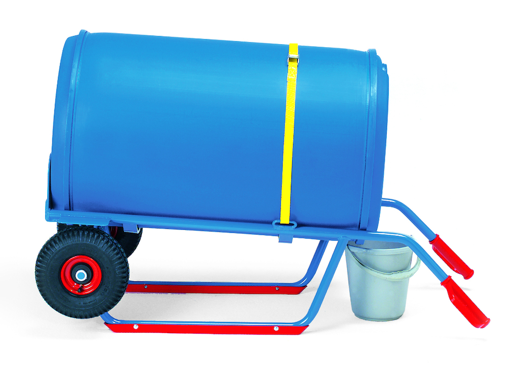 Mit dem Fasskarren aus sorgfältig verschweißtem Stahlrohr mit hochwertiger Pulverbeschichtung können Kunststoff-Fässer mit 120 bis 220 Liter Inhalt transportiert und gelagert werden. Er ist mit Sicherheits-Handgriffen und Gleitkufen aus rotem Kunststoff, zwei Ösen mit Spanngurt zur Fass-Sicherung und mit Luft-, Vollgummi- oder pannensicherer PU-Bereifung ausgestattet.