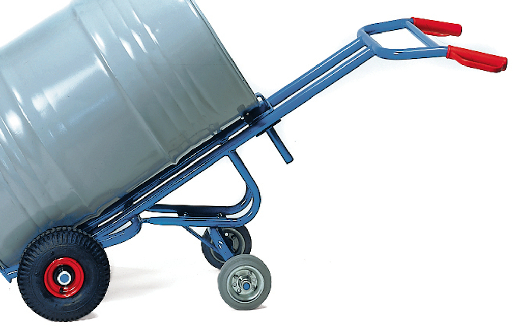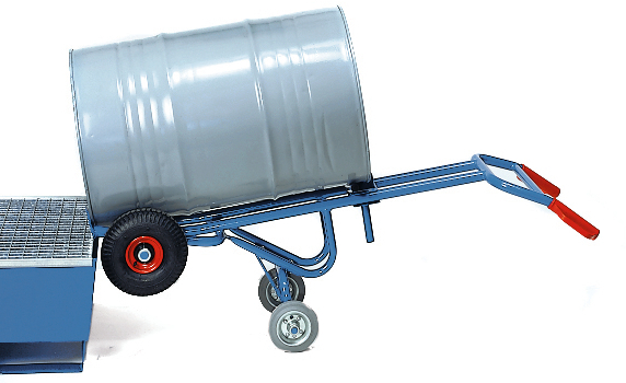 Mit dem Fasskarren aus sorgfältig verschweißtem Stahlrohr mit hochwertiger Pulverbeschichtung können alle 200-Liter-Fässer mit Rand transportiert werden. Er ist mit Sicherheits-Handgriffen aus rotem Kunststoff, einer Stützrädern mit Vollgummi-Bereifung und 2 Rädern mit Luft-, Vollgummi oder pannensicherer PU-Bereifung ausgestattet. Über den Stützradsatz können gefüllte Fässer sicher auf Paletten und Auffangwannen bis 360 mm Höhe abgestellt und von dort heruntergeholt werden.