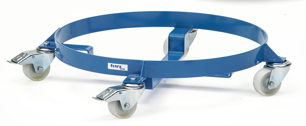 Der Fassroller in sorgfältig geschweißter Flachstahl-Konstruktion mit hochwertiger Pulverbeschichtung eignet sich zum Transport von Stahlblech-Fässern mit 60 und 200 Liter Inhalt. Der Außenring nimmt 200-Liter-Fässer auf, zur Aufnahme von 60-Liter-Fässern sind die Kreuzstreben nach innen durchgekröpft. Die vier Polyamidräder (2 davon mit Feststeller, Naben mit Gleitlager) sind spurlos (nicht kreidend) und daher auch für empfindliche Böden geeignet.