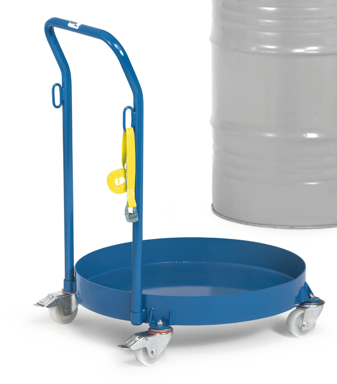 Der Fassroller in sorgfältig geschweißter Flachstahl-Konstruktion mit hochwertiger Pulverbeschichtung eignet sich zum Transport von Stahlblech-Fässern mit 200 Liter Inhalt. Er besteht aus einer Stahlblechwanne mit 8 cm hohem Rand (Boden und Rand sind öldicht verschweißt) und vier Polyamidrädern (2 davon mit Feststeller, Naben mit Gleitlager), die spurlos (nicht kreidend) und daher auch für empfindliche Böden geeignet sind. Ein anschraubbarer Rohrschiebebügel mit 2 Ösen und ein Zurrgurt mit Schnellverschluss sind im Lieferumfang enthalten.
