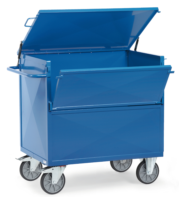 Der Blechkastenwagen ist in stabiler Schweißkonstruktion aus Stahlrohr und Profilstahl mit hochwertiger Pulverbeschichtung gefertigt und eignet sich bestens für alles, was sicher transportiert und aufbewahrt werden soll. Die Plattform besteht aus Stahlblech, die Wände und der 2-fach klappbare Deckel aus in Winkelstahl eingeschweißtem, gesicktem Stahlblech. Die vordere Wand ist geteilt, der obere Teil lässt sich abklappen. Der Schiebegriff am Wagen und der Griff am Deckel ist aus Stahlrohr. Zum Einhängen von Vorhängeschlässern sind Ringösen angebracht.