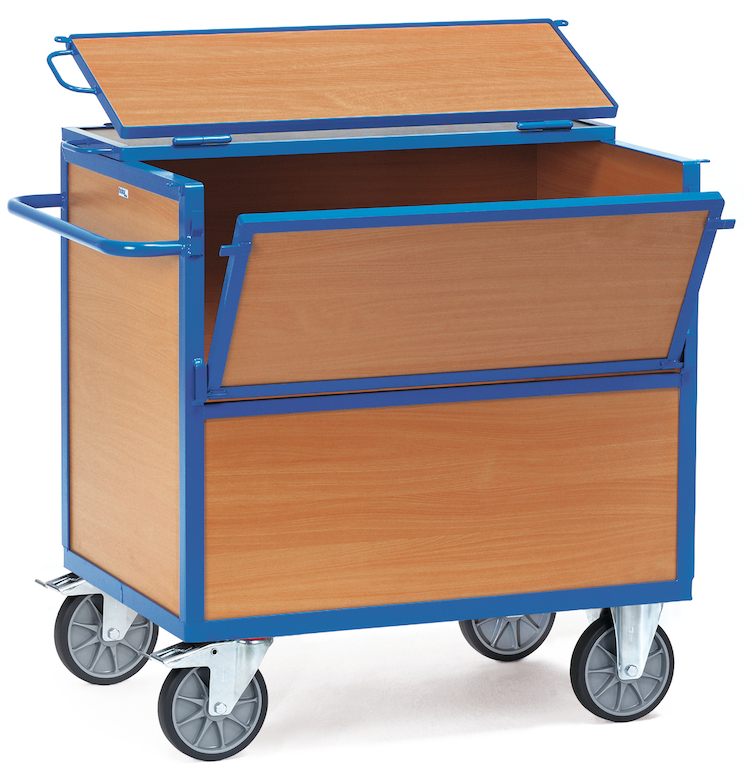 Der Holzkastenwagen ist in stabiler Schweißkonstruktion aus Stahlrohr und Profilstahl mit hochwertiger Pulverbeschichtung gefertigt und eignet sich bestens für alles, was sicher transportiert und aufbewahrt werden soll. Die Wände, der 2-fach klappbare Deckel und die Plattform bestehen aus in Winkelstahlrahmen liegenden Holzwerkstoffplatten, Oberfläche Buchendekor, der Schiebegriff aus Stahlrohr. Die vordere Wand ist geteilt, der obere Teil lässt sich abklappen. Zum Anbringen von Vorhängeschlössern sind Ringösen angebracht.