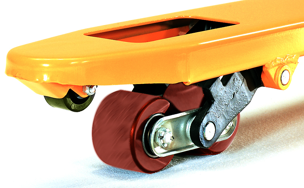 Die Lenkräder sind modellabhängig aus Nylon, Elastic-Vollgummi-Bereifung oder Polyurethan, die Tandem-Gabelrollen aus Nylon oder Polyurethan. Die Gabelspitzen sind mit Kletterrollen ausgestattet.