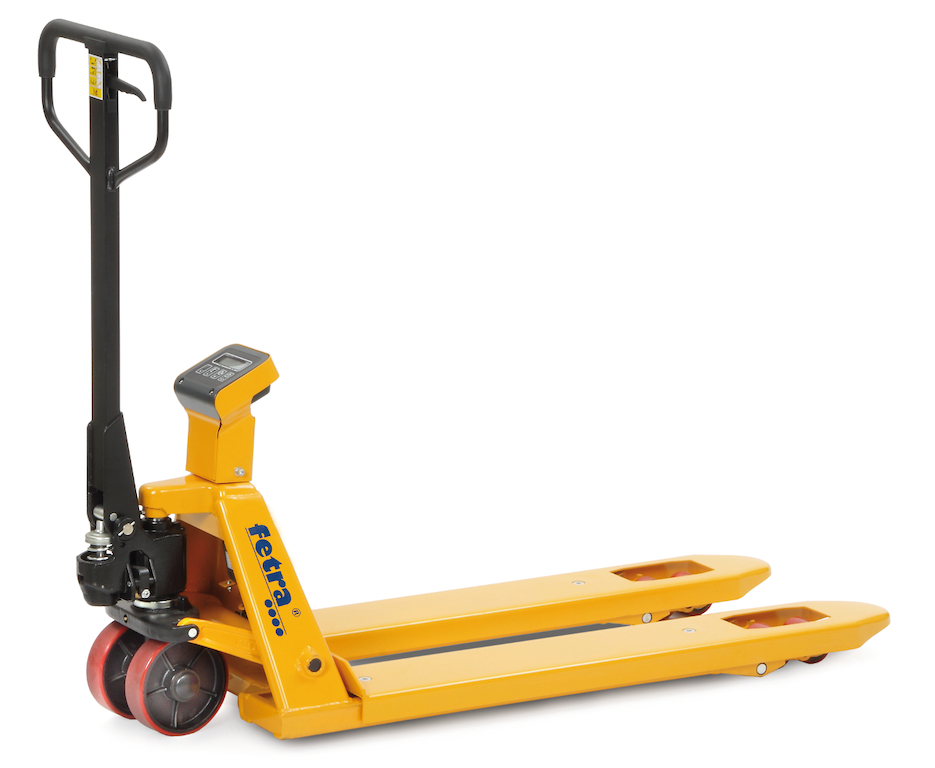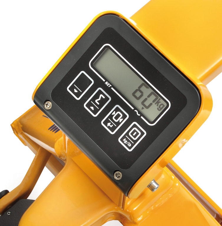 Rahmen und Gabel des Hubwagens sind in verwindungsfreier Schalenbauweise mit hochwertiger Pulverbeschichtung gefertigt. Die Ausstattung besteht aus einer wanrtungsfrei gelagerten hydraulischen Handpumpe, einer Waage mit LCD-Anzeige und einer stabilen Stahlrohrdeichsel mit Gegenlager für Schubbetrieb und gummiummalteltem Griff. Mit dem Bedienhebel können die Funktionen Heben, Fahren und Senken ausgeführt werden.