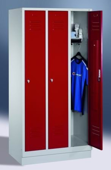 In der Schulsporthalle gehören genauso wie im Fitnesscenter, Schwimmbad und Wellnessbereich Garderobenschränke, Garderobenbänke und Schließfachschränke zur Garderoben-Grundausstattung, in denen die Sportler, Besucher und Kunden ihre Kleidung und Wertgegenstände sicher verstauen können. Pflegeleicht, stabil und zudem in vielen attraktiven Farben erhältlich sind Spinde und Schrankwände aus Metall. Die Auswahl der Sitzbänke richtet sich nach der Luftfeuchtigkeit im Raum. Umkleideräume mit hoher Luftfeuchtigkeit werden in der Regel mit Sitzbänken aus Kunststoff oder rostfreiem Metall ausgestattet, wogegen in Umkleidräumen mit normaler Luftfeuchtigkeit auch Sitzbänke aus Holz aufgestellt werden können. Die Schränke werden je zur Verfügung stehendem Platz entweder an der Wand als Schrankwand oder frei im Raum als doppelseitige Reihenschränke verwendet.Vorhängeschlösser oder eine Zentralverriegelung mit Sicherheitsschlössern machen die Umkleideschränke sicher vor unbefugtem Zugriff. Jeder Schlüssel ist an einem Schlüsselanhänger mit der Schranknummer befestigt. Eine weitere Möglichkeit sind Perlonarmänder mit Schlüssel, Chip oder numerierter Plakette. Zur weiteren Ausstattung der Garderoben zählen spezielle Kleiderbügel mit Wäschenetz, eine Schrankbeleuchtung, Spiegel und weitere Garderoben-Elemente wie Garderobenhaken und Hakenleisten.